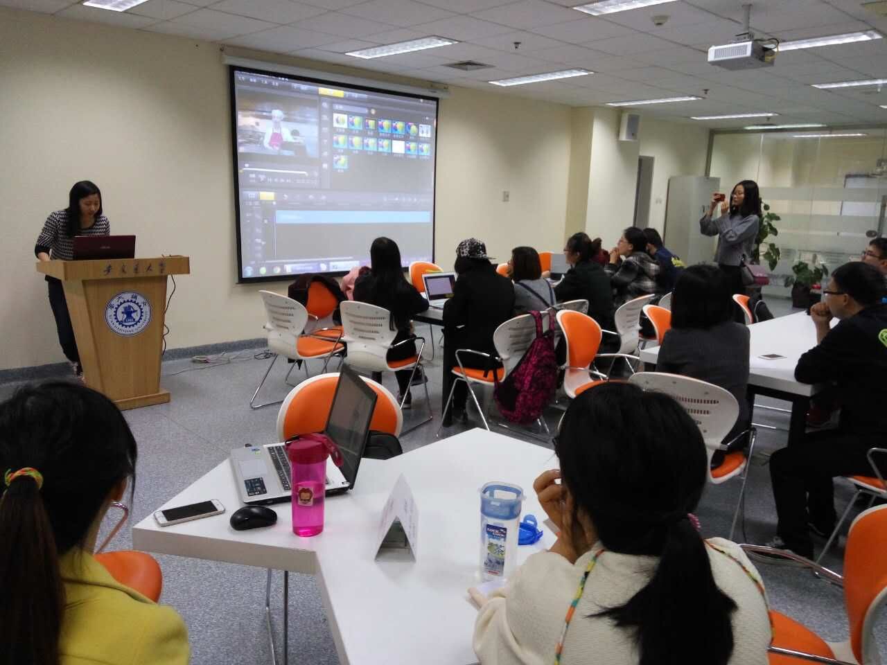 高宇妮同学介绍了视频制作工具——会声会影,并就整个视频制作的流程进行细致入微的说明,包括视频素材的筛选与剪辑、特效和转场的制作、声音和字幕的配比。培训会上,她展示了自己的作品并进行点评,告诉同学们要想做出好视频,很重要的一点就是不要滥用任何效果、模板和转场,简单达意最重要,要让视频展现出自然的美感。另外,音乐与所想表达的内容要匹配,节奏要清晰明了。高老师精彩的讲解仿佛让同学们回到了记忆中看过的那些电影特效背后的故事,怀揣着一颗剪辑师的心,心头蠢蠢欲动,听得如痴如醉。