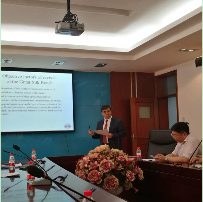 Abdughani Mamadazimov教授从经济、政治、文化角度全面介绍了“丝绸之路经济带”的发展及塔吉克斯坦对中国“一带一路”倡议的理解,并提出了新加坡—西安—圣彼得堡这一重要经济通道的历史起源和文化背景。Mamadazimova Mairam Mukhiddinovna教授作为塔吉克斯坦丝路-联合之路国家基金会主席,特别介绍了塔中双方自古友好的文化往来,并讲解了塔中之间交往的历史。与会教授和同学与塔吉克斯坦客人进行了热烈的的互动讨论,取得了积极的效果。