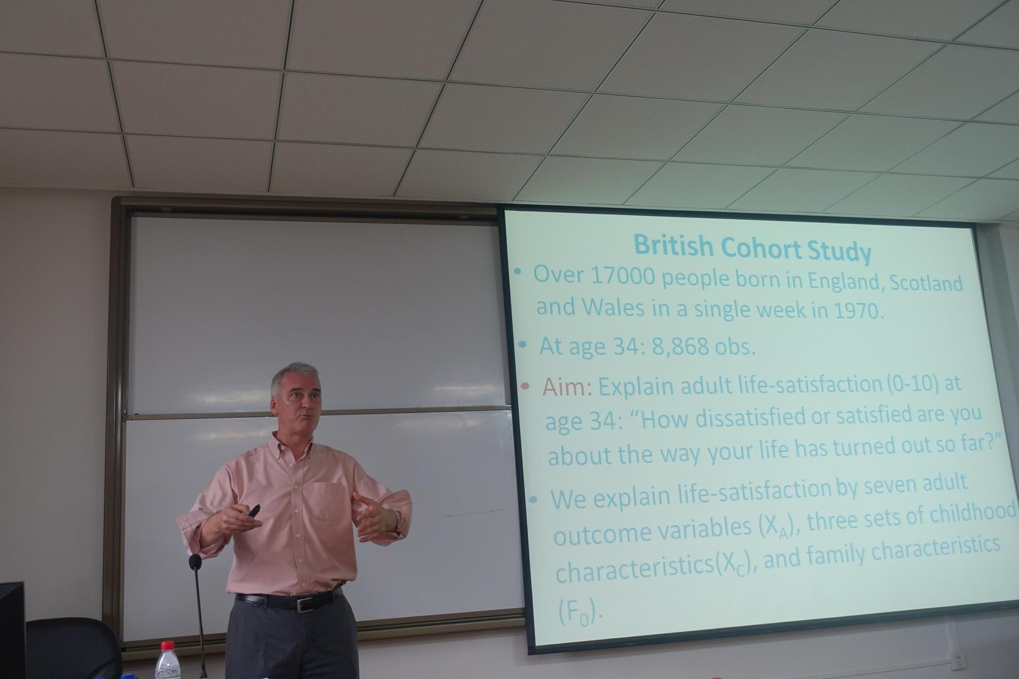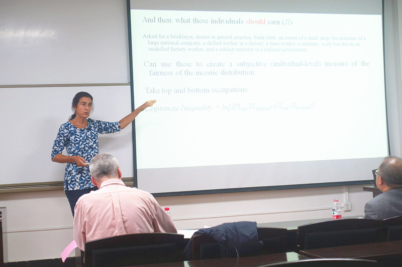 在随后的报告会上,Conchita教授作了题为“Unfairness at Work: Well-Being and Quits”的报告,报告实证研究了工作离职对幸福感的影响。Andrew E.Clark教授的报告题目为“The effects of mother's financial problems: birth and young adulthood outcome”,报告描绘了一幅何为成功的美好画卷,并借助微观跟踪调查数据解释了母亲财务问题对孩子出生和成年成功的影响效应。报告会上,不断有师生与两位学者进行相关问题的探讨,现场气氛愉悦、融洽。