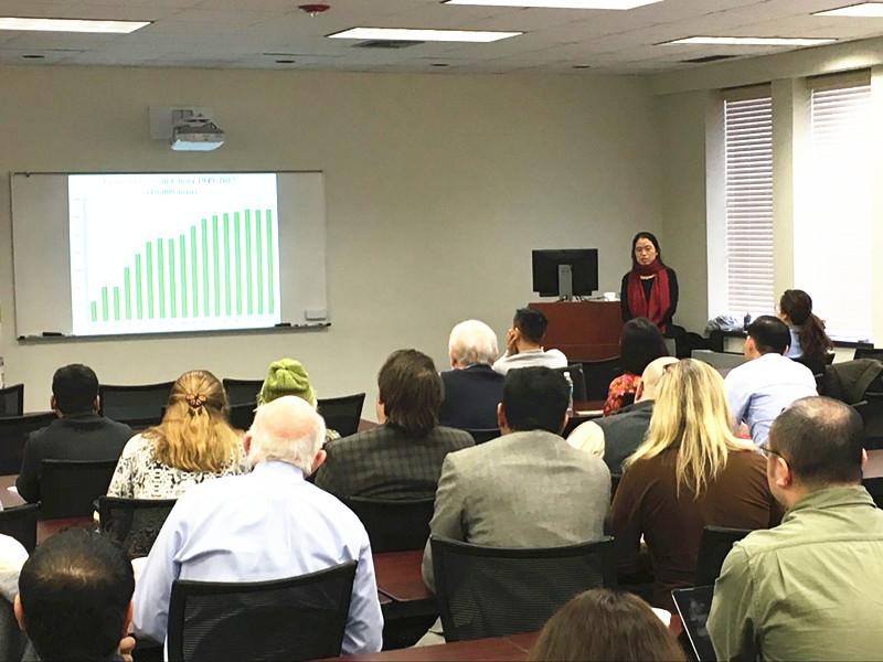 在美访问学者张慧芳老师应所访问学校德州农工大学(TEXAS A&M UNIVERSITY COMMERCE)商学院院长的邀请,为该院40多位教师做了题为 “了解真实的中国—经济视角”(Understanding Real China----from economic perspective)的学术报告。在1个多小时的英文报告中,张慧芳老师从历史成就、问题、前瞻、差距四个方面,通过数据、照片,图文并茂地介绍了中国经济发展的全貌. 商学院全体老师围绕张慧芳老师报告进行了热烈讨论,表示张慧芳老师报告增加了大家对中国、特别是中国经济的了解。商学院院长Shanan.Gibson教授对报告给予高度评价,表达了今后进一步加强与91porn