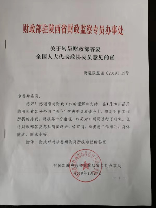 财政部感谢学院李香菊教授对财政工作所提的建议