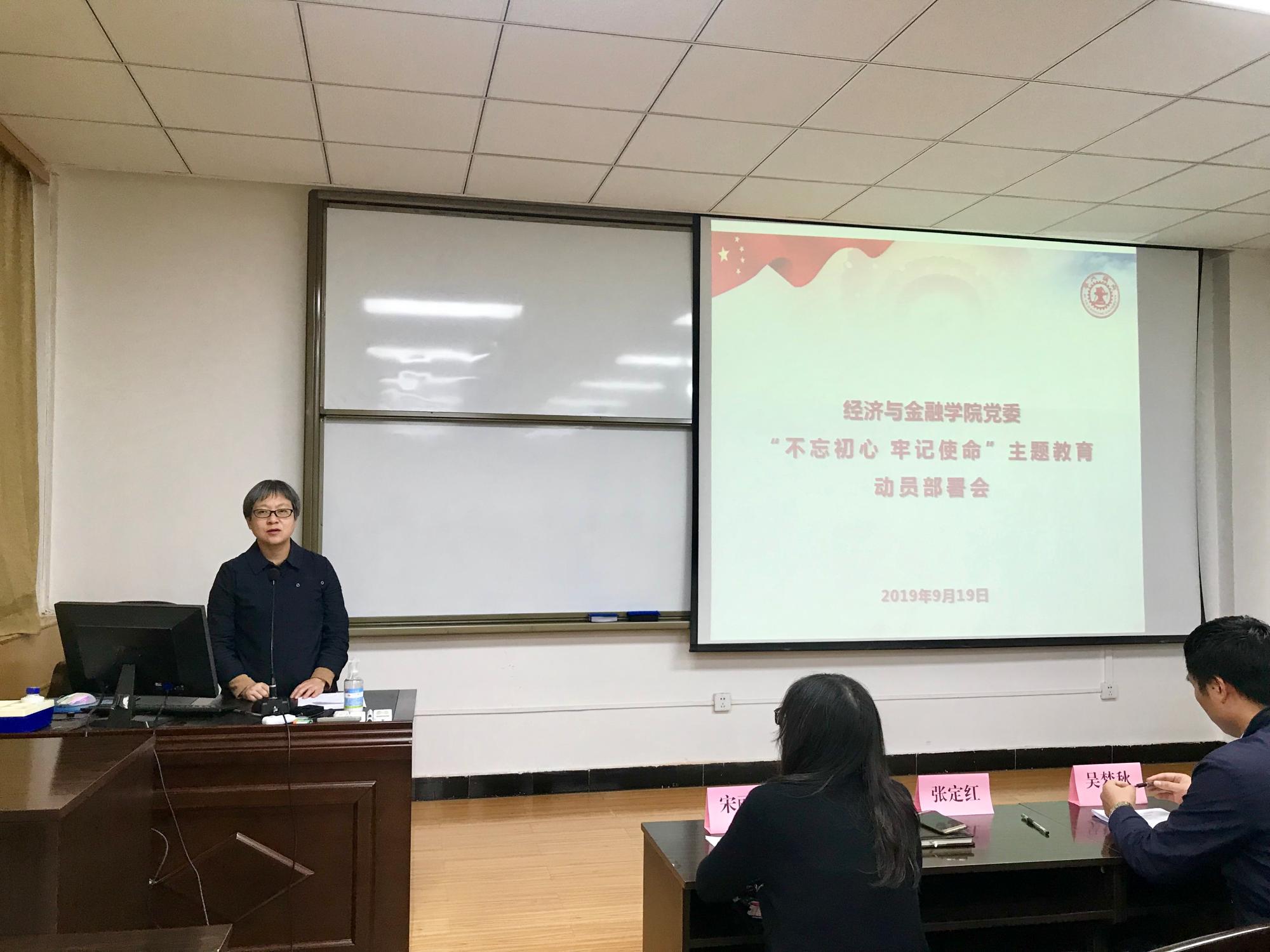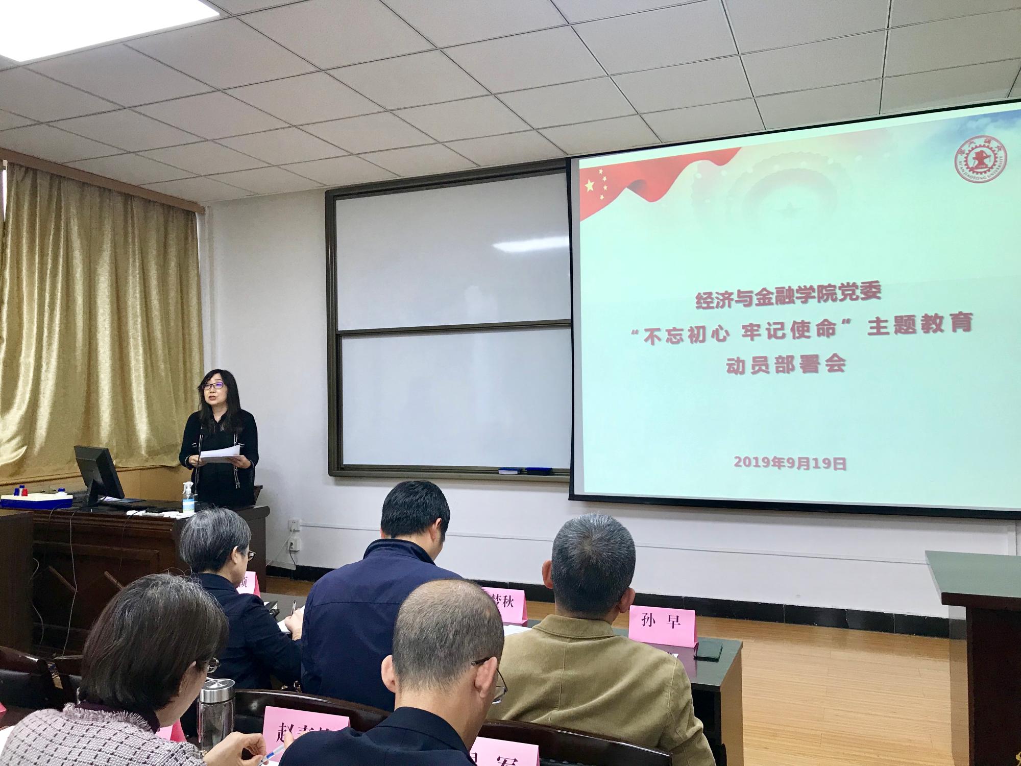 “不忘初心 牢记使命”主题教育工作方案》,并对学院主题教育进行安排部署。她强调,开展主题教育,要认真贯彻习近平总书记重要指示精神和中央部署要求,把深入学习贯彻习近平新时代中国特色社会主义思想作为根本任务,全面把握守初心、担使命,找差距、抓落实的总要求。她表示,主题教育是一个长期学习的过程,领导班子要带好头,全体党员同志要充分认识主题教育的重大意义,坚持理论联系实际,和自身工作相结合,围绕学校十项重点任务开展工作,将学习成果落到实处,共同推进学院发展。