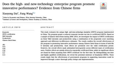 副教授戴小勇在国际SSCI权威期刊《China Economic Review》发表了题为《Does the high- and new-technology enterprise program promote innovative performance? Evidence from Chinese firms》的学术论文。