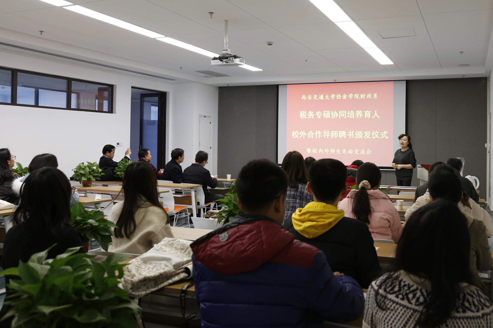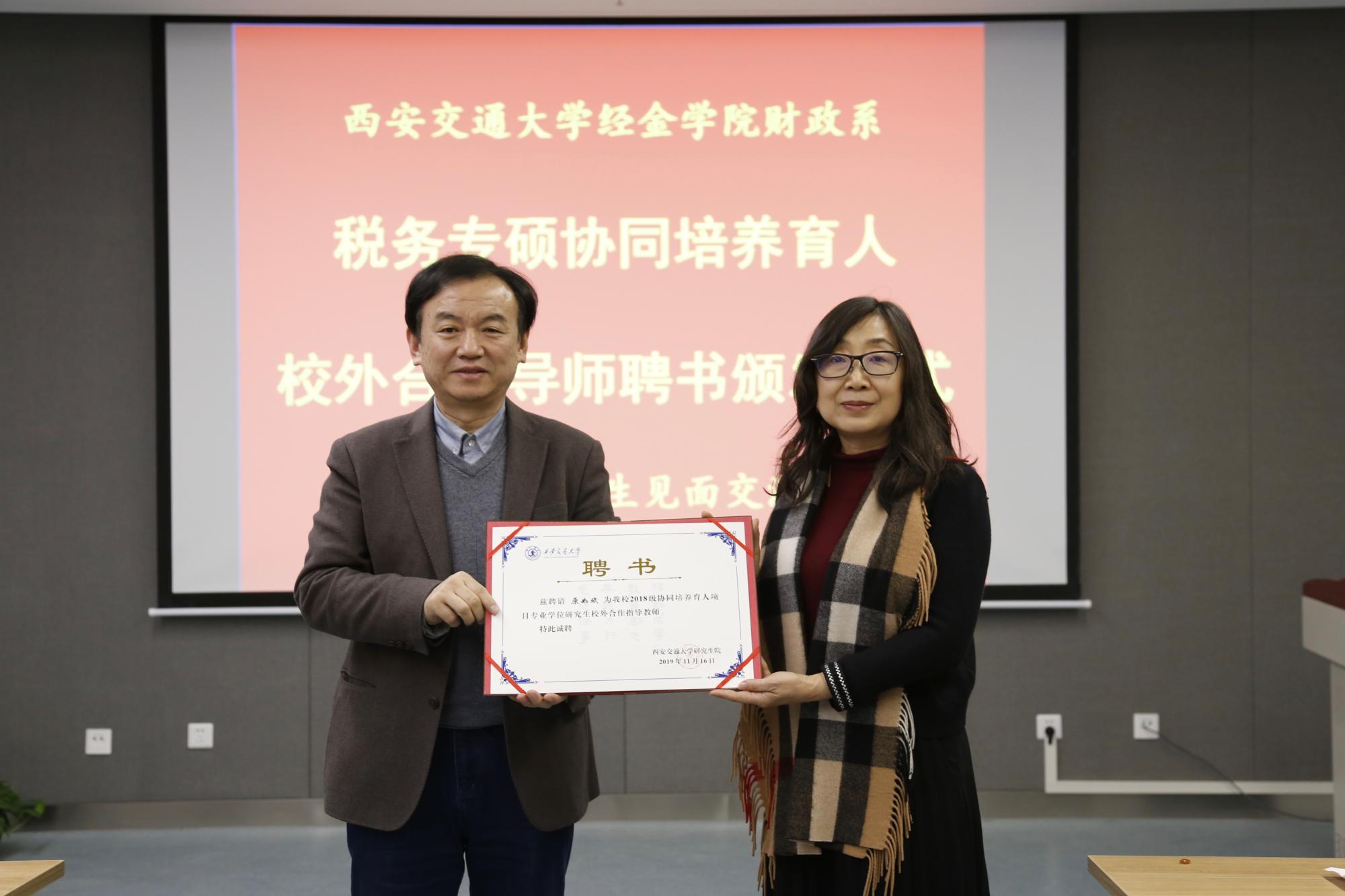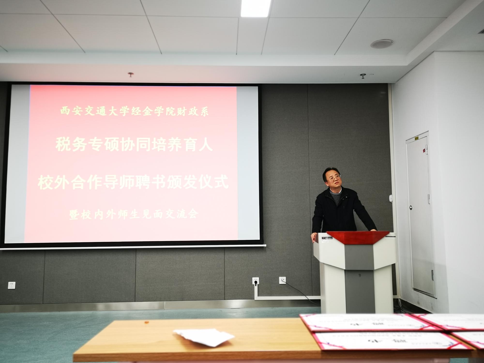2019年12月26日下午,财政系在创新港涵英楼8088报告厅举行了税务专硕协同培养育人校外合作导师聘书颁发仪式暨校内外师生见面交流会。参加会议的有本次受聘的四位校外合作导师,他们分别是:国家税务总局西安市税务局法规处处长魏春田;国家税务总局西安市税务局焦雅林博士;陕西益友会计师事务所所长原如斌;西部信托股份有限公司高级调研员原公司副总经理蔡长生,以及财政系老师和2019级税务专硕全体同学,会议由财政系主任王俊霞主持。