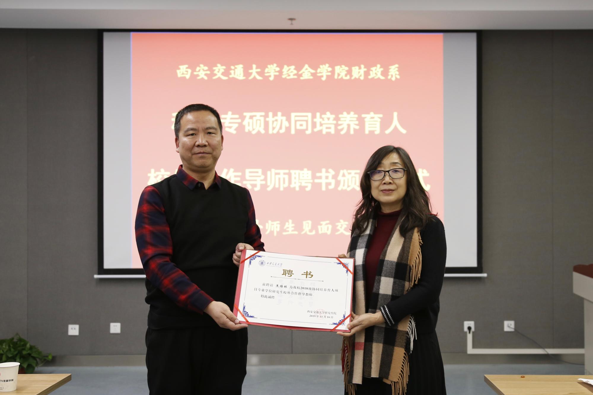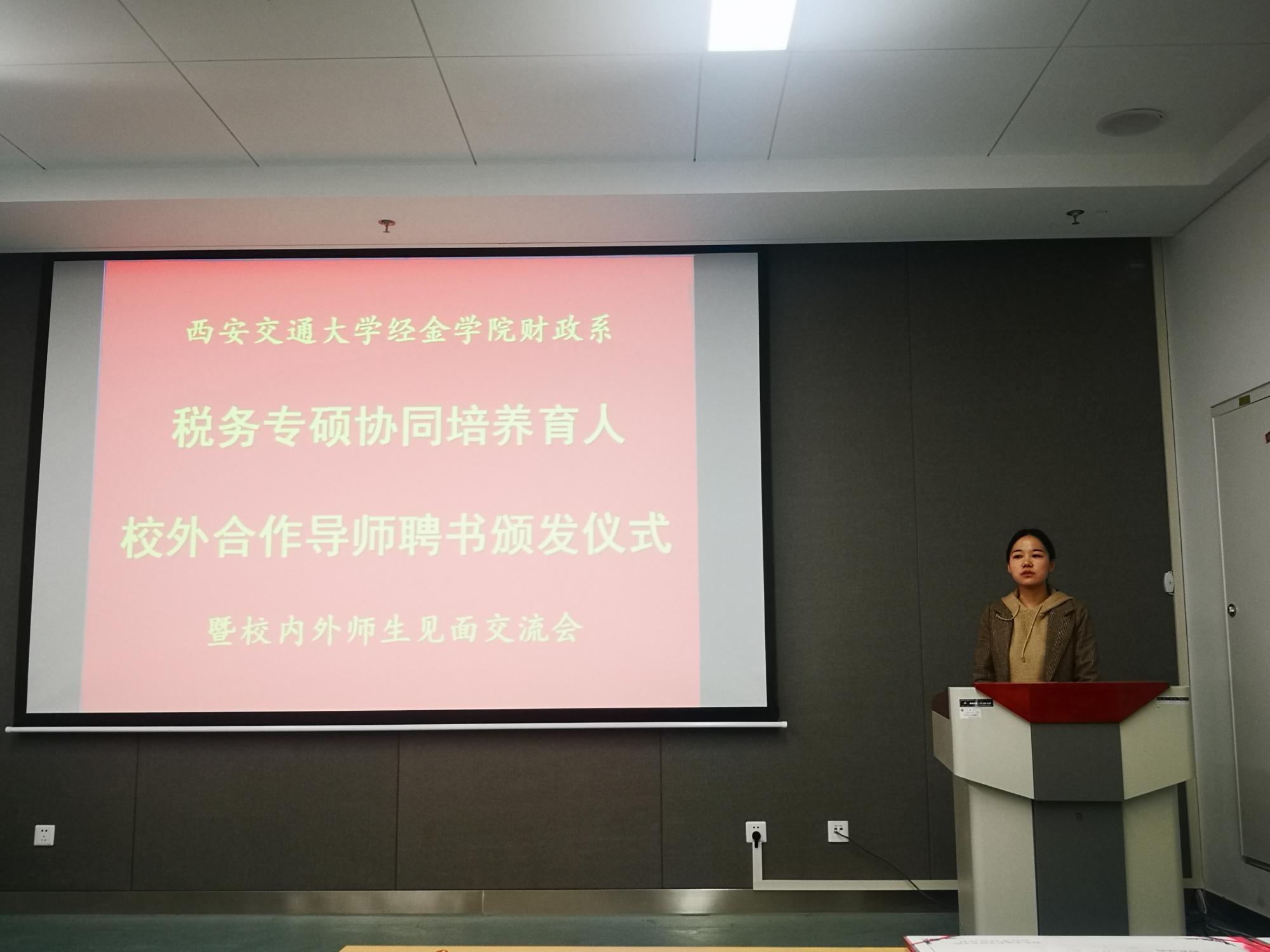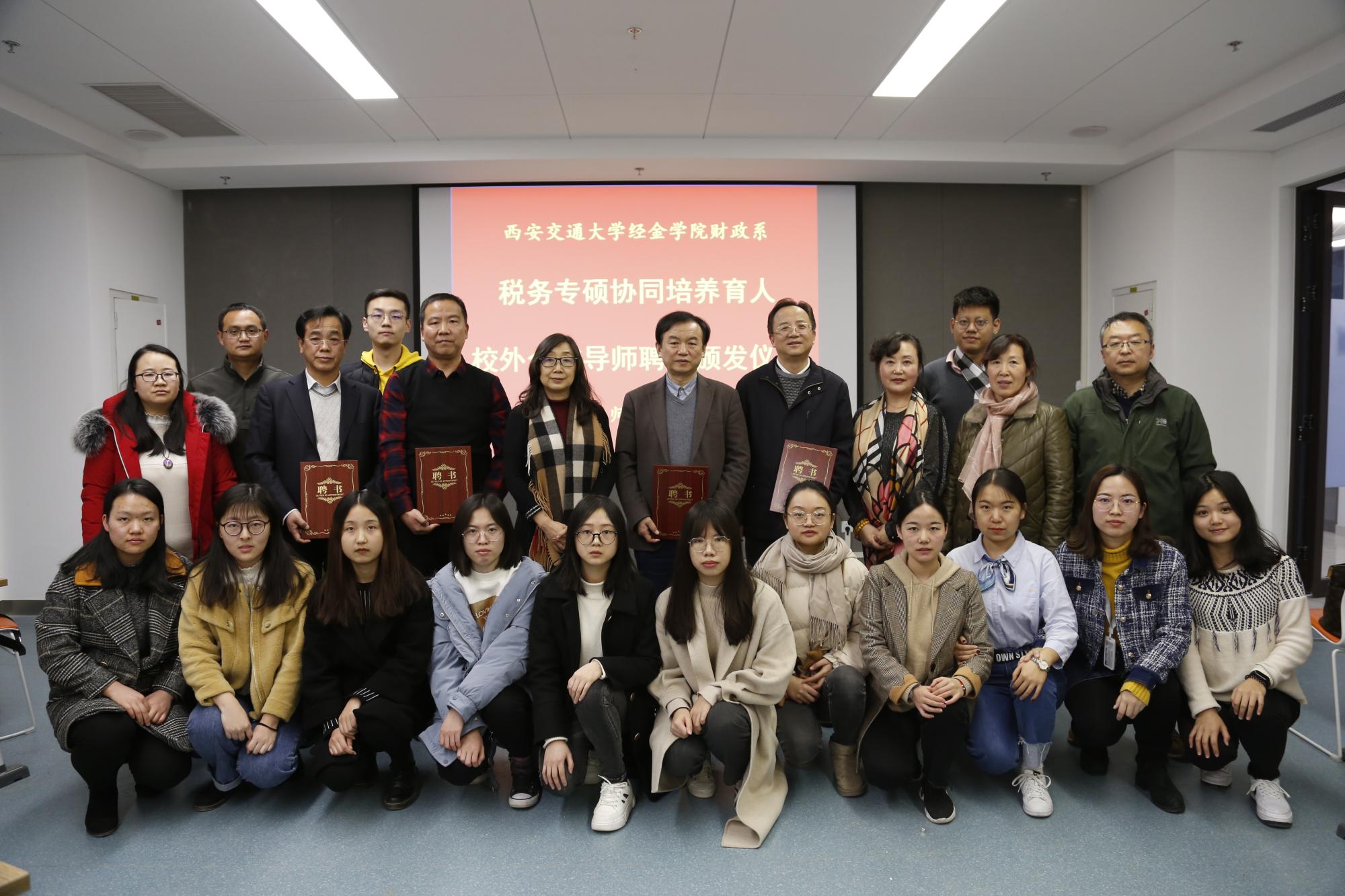 2019年12月26日下午,财政系在创新港涵英楼8088报告厅举行了税务专硕协同培养育人校外合作导师聘书颁发仪式暨校内外师生见面交流会。参加会议的有本次受聘的四位校外合作导师,他们分别是:国家税务总局西安市税务局法规处处长魏春田;国家税务总局西安市税务局焦雅林博士;陕西益友会计师事务所所长原如斌;西部信托股份有限公司高级调研员原公司副总经理蔡长生,以及财政系老师和2019级税务专硕全体同学,会议由财政系主任王俊霞主持。