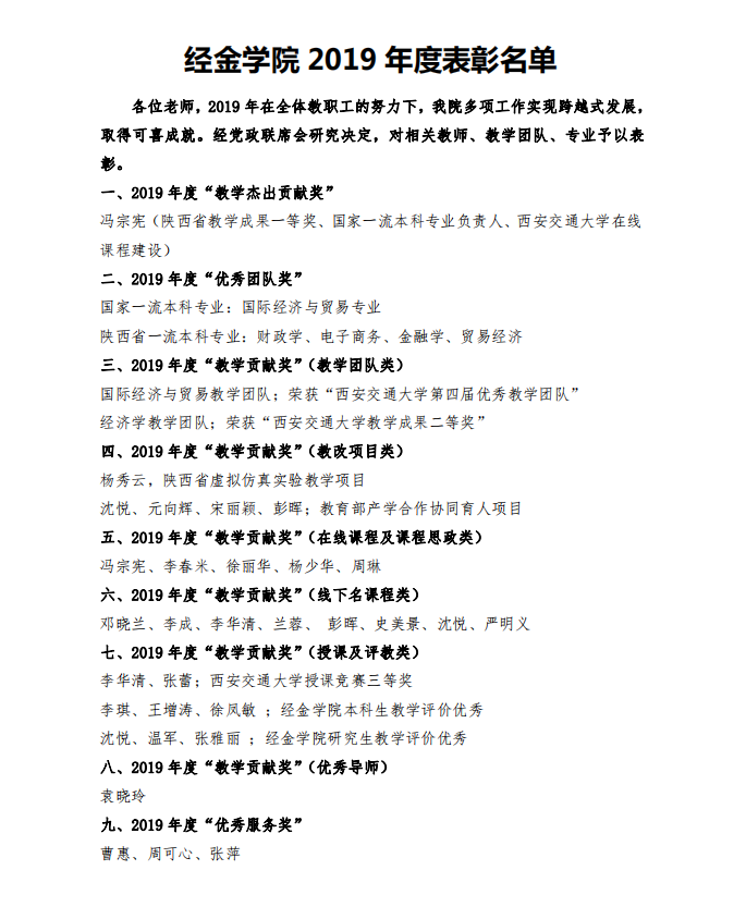 2019年度表彰决定》。此次表彰共九个奖项,分别为:教学杰出贡献奖、优秀团队奖、教学团队类教学贡献奖、教改项目类教学贡献奖、在线课程及课程思政类教学贡献奖、线下名课程类教学贡献奖、授课及评教类教学贡献奖、优秀导师类教学贡献奖、优秀服务奖,共表彰7个团队、31人次。获奖教师代表李华清老师向大家分享了个人教学经验,表示在日后工作中将继续发挥在教学工作上的优势,发挥长处补齐短板,为学院的发展做出贡献。