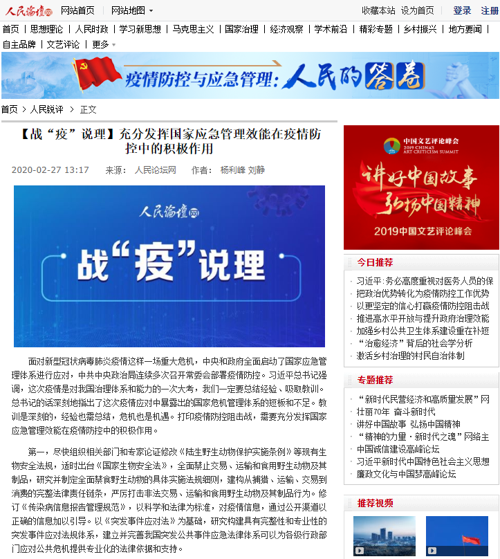 编者按:习近平总书记在2月3日召开的中共中央政治局常务委员会会议上强调,这次疫情是对我国治理体系和能力的一次大考,我们一定要总结经验、吸取教训。为深入宣传贯彻落实习近平总书记关于疫情防控的重要讲话精神,坚决打赢疫情防控阻击战,人民论坛网现推出“疫情防控与应急管理:人民的答卷”主题征文活动,本文系我院教师发表的入选建言建策。
