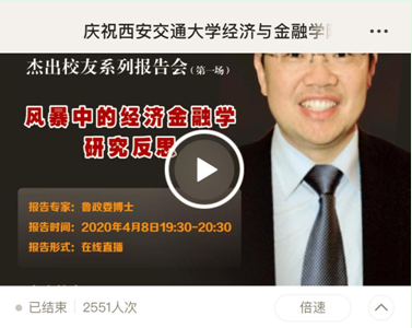 鲁政委博士的学术报告从当前影响全球经济走势的新冠疫情和美国金融市场剧烈动荡展开,以一个研究者的敏锐提出未来经济金融学发展八个值得关注的新方向,如流行病经济学,宏观经济学的可试验性,现代货币理论(MMT/MP3)的重新思考,气候、病毒与环境的经济金融风险管理,低利率的危害,资产配置理论的新方向等,既深入思索了当前的经济金融政策,也对未来经济走势提出了合理的预判,更提出了未来值得研究的新问题。鲁政委博士理论视阈的宽广性、现实观察的前沿性、观点论证的严谨性,使得报告会精彩纷呈,吸引了我校师生、校友、网友以及媒体界人士2300余人同步在线收看,纷纷在评论区留言,与主讲人互动交流。截至发稿时,登陆在线平台回看演讲的用户数仍在不断增长。