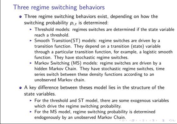 ,后于卡迪夫大学获得博士学位,在英国卡迪夫大学担任助理教授。本讲徐老师主要介绍了三种Regime Switching Models: Threshold models, Smooth Transition (ST) models,和Markvo Switching (MS) model,并结合实例和自己的研究成果对模型的应用进行深入