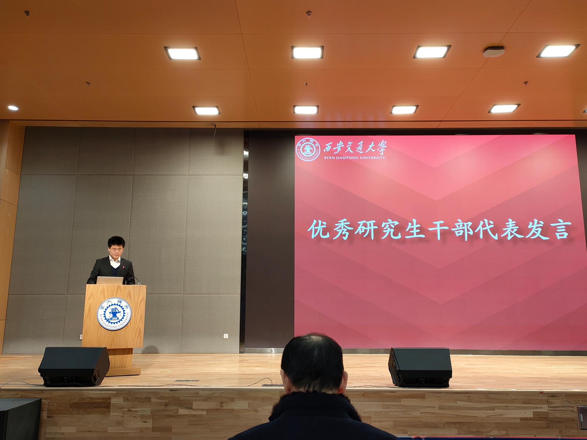 博文经济学社负责人蒋旸阳同学作为优秀研究生干部代表上台发言。他向同学们分享了自己在搞好学习以及科研工作的同时做好社团工作的经验。他说,拖延症是当下很多研究生同学的“通病”,希望大家克服缺点,珍惜在校时光,努力奋发向上,发挥学生干部的模范带头作用。他说,2021年是实施“十四五”规划、开启全面建设社会主义现代化国家新征程第一年。博文经济学社将积极组织同学们认真学习研读《中共中央关于制定国民经济和社会发展第十四个五年规划和二〇三五年远景目标的建议》,并结合所学专业知识进行思考。希望同学们面向国民经济主战场,积极投身科研和社会实践中去,做出无愧于这个时代的新贡献。