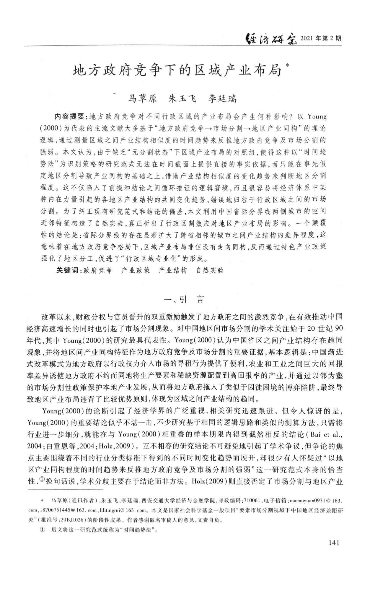 青年教师马草原教授与博士生朱玉飞、李廷瑞合作撰写的论文《地方政府竞争下的区域产业布局》认为,由于缺乏“无分割状态”下区域产业布局的对照组,使得现有研究的识别策略无法在时间截面上提供直接的事实依据,而只能在事先假定地区分割导致产业同构的基础之上,借助产业结构相似度的变化趋势来判断地区分割程度。这不仅陷入了前提和结论之间循环推证的逻辑窘境,并且很容易将经济体系中某种内在力量引起的各地区产业结构的共同变化趋势,错误地归咎于行政区域之间的市场分割。