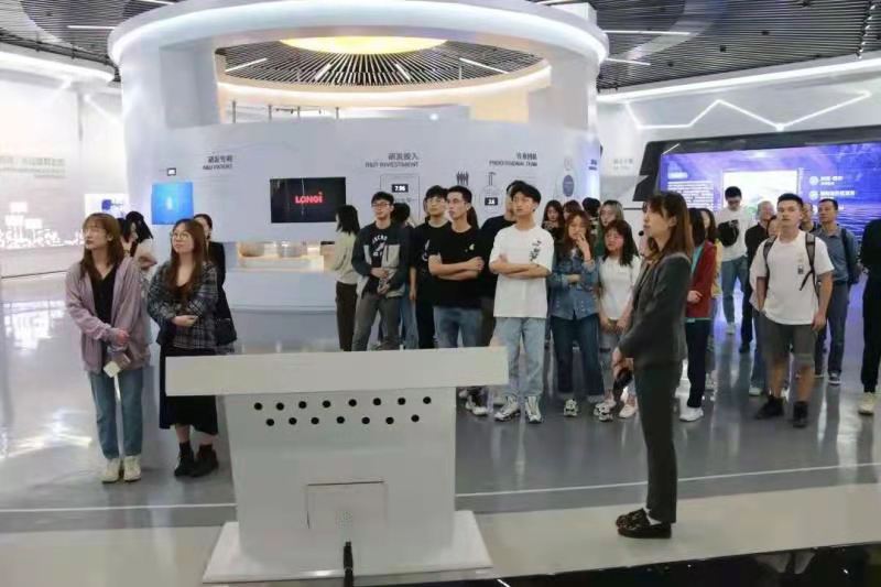 师生代表在隆基股份员工引领下参观了融声光电于一体、科技感十足的隆基绿能智慧能源展览馆,深入了解了隆基股份的经营理念、91porn、发展历程及行业地位,以及能源行业的发展前景。