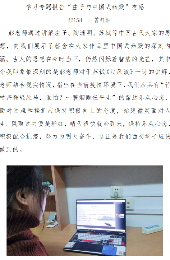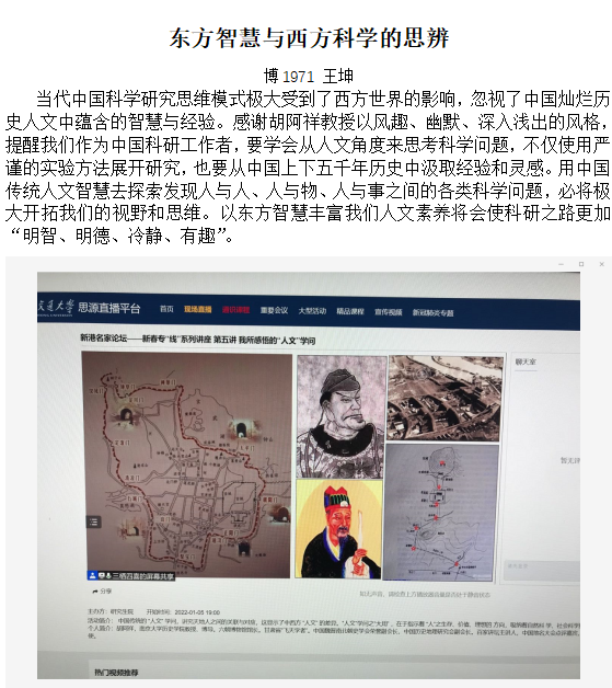 1月1日起,研究生院组织学生参加“名家云端聚专“线”,凝心聚气克时艰——西安交大举行新港名家论坛新春专“线”系列讲座”,在贯彻落实学校疫情防控决策部署的基础上,促进思维创新、激发学术创造、维护师生心理健康。一系列的精品讲座引发了热烈反响与积极讨论,学生参与讲座的积极性非常高,为期六讲的讲座全程参与,并写下观后心得相互交流分享。
