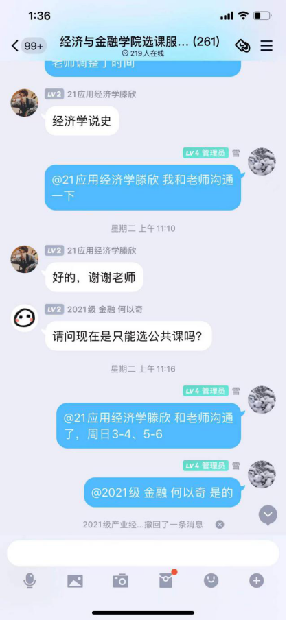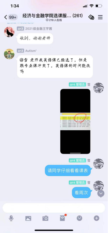 1月4日上午10点,学生在系统上开始选课,教务秘书积极回答学生选课过程中的疑问直到深夜。当课程出现冲突,教务秘书通过协调学生与老师的时间安排,将课程调整到合适的时间,得到学生和老师的一致好评。