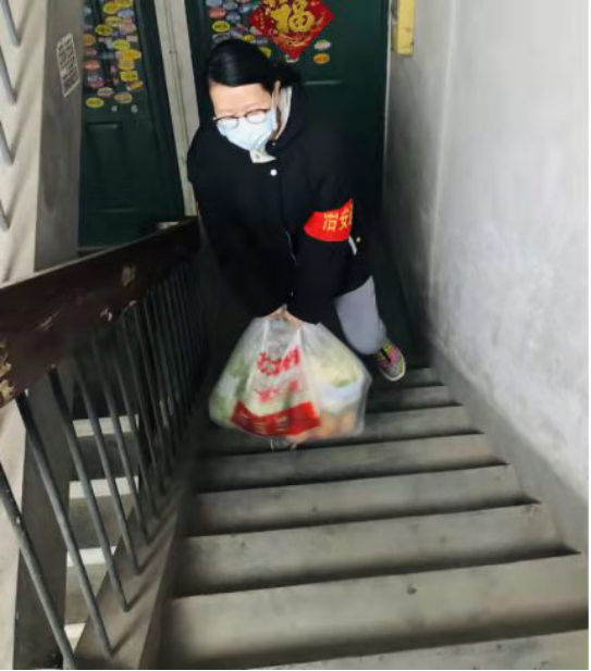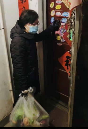在送蔬菜上门的过程中,志愿者们为了不打扰已进入梦乡的居民,爬上楼梯后把菜轻轻放在住户门口,然后接着再取菜送到下一户。