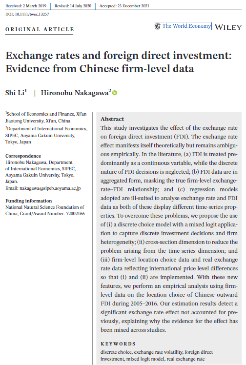 青年教师李石博士与日本青山学院大学(Aoyama Gakuin University)Hironobu Nakagawa教授合作撰写的《Exchange rates and foreign direct investment: Evidence from Chinese firm-level data》(汇率和国际直接投资:来自中国企业级数据的证据)在国际经济学权威期刊《The World Economy》(世界经济)上发表。