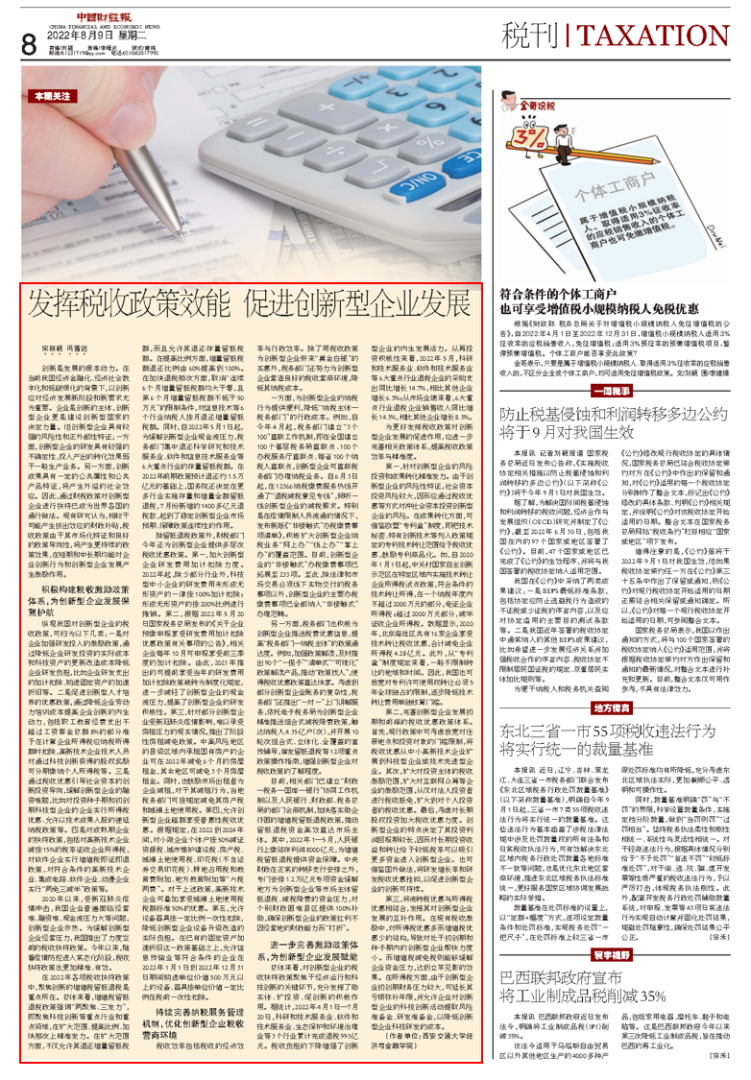 在2022年各项税收扶持政策中,聚焦创新的增值税留抵退税是重点所在。总体来看,增值税留抵退税政策强调“两聚焦、三发力”,即聚焦科技创新等重点行业和重点领域,在扩大范围、提高比例、加快频次上精准发力。在扩大范围方面,不仅允许其退还增量留抵税额,而且允许其退还存量留抵税额。在提高比例方面,增量留抵税额退还比例由60%提高到100%。在加快退税频次方面,取消“连续6个月增量留抵税额均大于零,且第6个月增量留抵税额不低于50万元”的限制条件,对信息技术等6个行业纳税人按月退还增量留抵税额。同时,自2022年5月1日起,为缓解创新型企业现金流压力,税务部门集中退还科学研究和技术服务业、软件和信息技术服务业等6大重点行业的存量留抵税额。在2022年前期政策预计退还约1.5万亿元的基础上,国务院还决定在更多行业实施存量和增量全额留抵退税,7月份新增的1400多亿元退税款,起到了稳定创新型企业市场预期、保障政策连续性的作用。