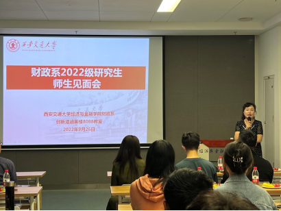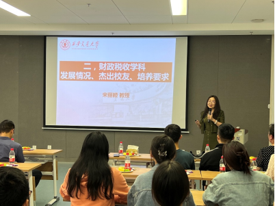 党委书记、财政学科带头人宋丽颖教授向师生们介绍了目前财政税收学科发展情况、我国财政与税收发展的历史、当代中国财政税收制度发展现状,对财政学硕和税务专硕的培养要求进行了详细介绍,同时也介绍了财政系的杰出校友,鼓励同学们认真学习前沿知识、努力开展科学研究、积极投身社会实践,力争成为优秀的交大学子。