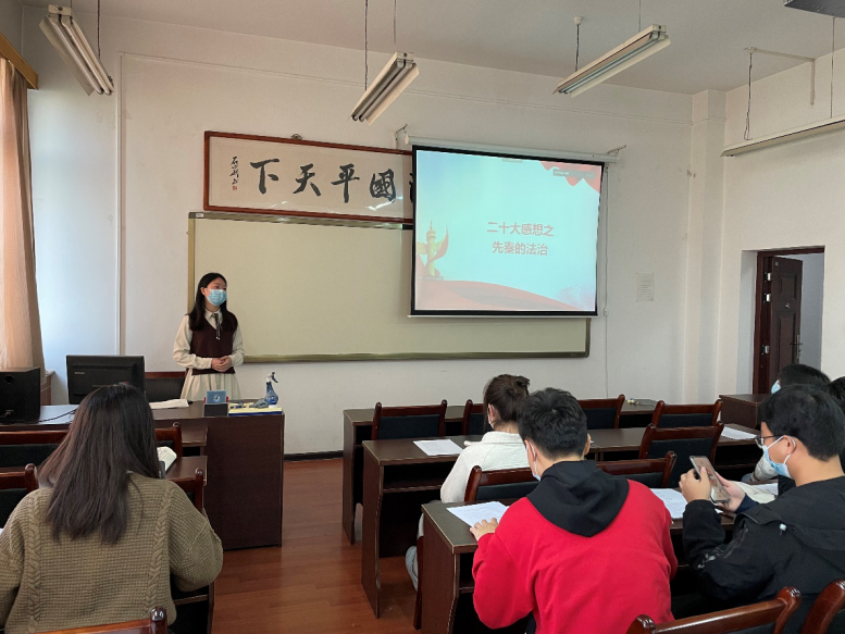 讲活历史故事,牢记历史使命。今天的幸福承载着中华民族的深厚历史,回顾我国的发展,中国共产党领导人民打江山、守江山,为人民谋取幸福,取得了辉煌成就。新时代青年要立足当下展望未来的同时,还应以史为鉴,加强理论学习。赵明明同学以党的“二十大”为契机,从历史角度对中国法制演变进行了讲解,并希望同学们在对历史的回顾中汲取前进的力量,将初心和使命镌刻于心,锤炼忠诚、担当的政治品格,努力创造无愧于时代的光辉业绩。