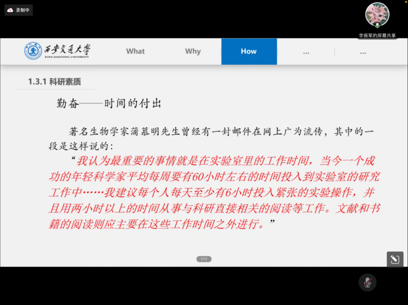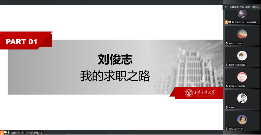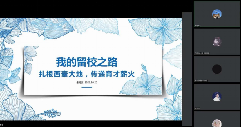 辅导员朱博文老师为同学们做了“我的留校之路:扎根西秦大地,传递育才薪火”主题分享,朱老师从个人经历、辅导员的职责、留校原因、准备方法、思想情怀五个方面分享了留校相关经验与建议。朱博文老师建议同学们怀揣感恩之心,牢记西迁精神,在适合自身的发展路径上发光发热,为社会做出力所能及的奉献。