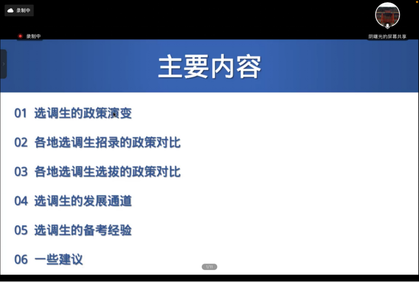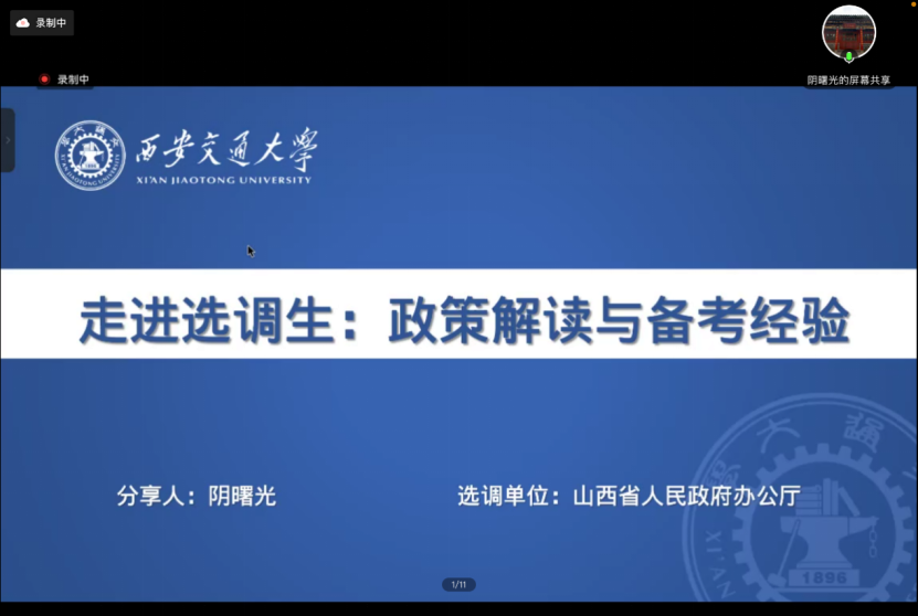 学院理论经济学专业2021届硕士毕业生阴曙光为同学们进行了“走进选调生:政策解读与备考经验”主题分享,主要分享了选调生的政策演变、招录选拔政策对比、发展通道、备考经验、注意事项等内容。阴曙光建议同学们提升自身思想水平,及时获取选调的相关信息,并分享了相关信息的获取渠道。