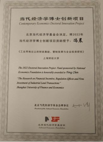 2022年11月20日,作为我国经济学研究领域的代表性奖项之一,2022年“当代经济学博士创新项目”获奖名单正式揭晓,我校财政系助理教授冯晨博士的论文《工业用地出让的财政激励、管制效果与企业投资研究》在经过匿名初审和复审答辩环节后,从全国各高校所推荐的百余篇经济学博士论文中脱颖而出,获此殊荣。