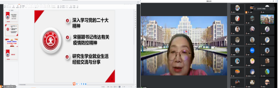 宋丽颖书记介绍了学校和学院应对疫情的工作机制,汇报了当前学院疫情防控的最新工作进展,充分肯定了老师和同学们积极应对疫情的出色表现,鼓励师生通过各类有意义的活动去丰富校内生活,传递各种正能量,同学们应相互帮助增进友谊。关于校园安全事宜,宋书记要求大家要高度重视安全工作,务必敲响安全警钟,强调一定要做好办公室和宿舍的安全,注意人身及财产安全,谨防网络诈骗问题。