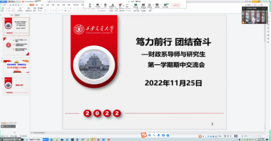 2022年11月25日晚上7点30—9点30,财政系全体老师和博士、硕士研究生80多人,以视频会议的方式,开展“笃力前行 团结奋斗——财政系导师与研究生第一学期期中交流会”,会议由财政系主任王俊霞主持。此次交流会的主体包含三方面的内容:第一,深入学习党的二十大精神;第二,传达学校和学院疫情防控精神和校园安全工作部署;第三,研究生学业、就业和生活等方面存在的问题、经验交流与分享。