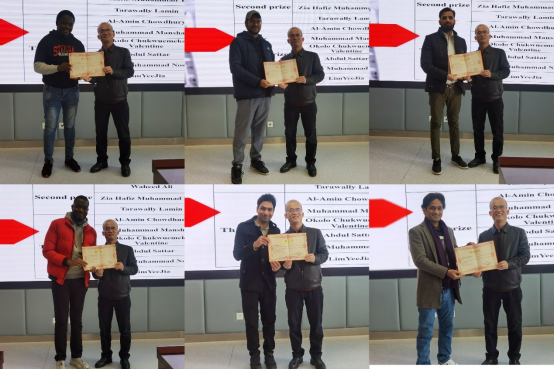 针对三年以来受新冠疫情影响,大部分留学生线上听课,缺乏与老师面对面的沟通交流,学习进展有限,对学校和学院生疏等情况,温军副院长表达了对同学们的热情的关心和诚挚的问候,然后,向去年征文获奖的十位同学颁发获奖证书。