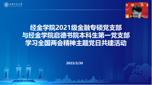 启德书院本科生第一党支部共同开展学习全国两会精神主题党日共建活动。本研党支部全体党员、发展对象、入党积极分子近200人参加,2021级金融专硕党支部书记李永鼎主持会议。