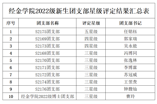 团委于2023年4月对2022级研究生新生团支部组织进行了星级评定推荐工作。经团支部自评、学院复评和校级终评,2022级研究生新生团支部在校级星级评定中获得好成绩,S2175团支部被评为“五星级”团支部,S2169和S2173团支部被评为“四星级”团支部。