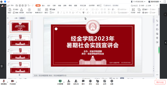 社会实践中心专项组的马瑞赛汇报了学院2023年暑期社会实践工作的具体安排。她从暑假社会实践政策要求解读出发,对实践安排、实践要求、立项安排、过程考核等方面进行了详细的解读,叮嘱同学要时刻关注平台消息,严格按照相关要求,有目的、有计划、有组织的开展社会实践活动,活动内容要全面、丰富、充分、翔实,决不可照搬照抄或随意敷衍,要在实践中展现经金学子奋发有为、胸怀家国、谦逊进取的精神面貌。