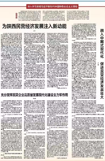 当前,世界之变、时代之变、历史之变正以前所未有的方式展开。我国经济已由高速增长阶段转向高质量发展阶段。民营经济作为推进中国式现代化的生力军,在推动经济增长、稳定就业、促进增收、保障民生等方面贡献巨大,是高质量发展的重要基础。此前,《中共中央国务院关于促进民营经济发展壮大的意见》(以下简称《意见》)发布,围绕持续优化民营经济发展环境等七个方面作出重大部署。7月24日召开的中共中央政治局会议强调,“要持续深化改革开放,坚持‘两个毫不动摇’,切实提高国有企业核心竞争力,切实优化民营企业发展环境”。陕西省委、省政府十分重视民营经济发展,极为珍视广大民营企业和民营企业家。从高质量项目推进年、营商环境突破年、干部作风能力提升年“三个年”活动开展到全省民营经济高质量发展大会召开,都是“大力推动民营企业融入现代化建设场景,切实以转型之变引领陕西民营经济健康发展高质量发展新跨越”,向全社会释放了始终鼓励支持民营经济和民营企业发展壮大的强烈信号。