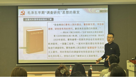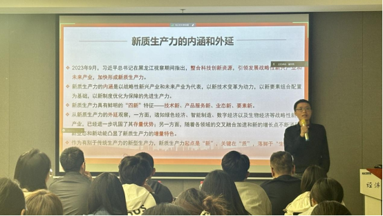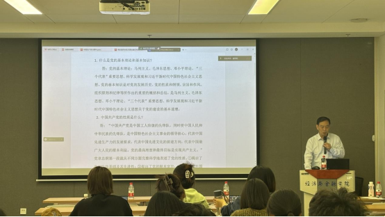 教授李江龙老师、党委组织员董娜老师以及辅导员王平老师为同学们开展专题授课。刘源老师以《毛泽东调查研究的理论和实践》为主题,强调“没有调查,就没有发言权”,敦促学生们科研工作一定要坚持实事求是的原则,善于调查研究,勇于实践创新。李江龙老师结合经济学专业实际,以《新质生产力与碳中和目标》为主题,与学生们探讨了新质生产力与碳中和目标之间的内在联系,帮助学生们深化了对新质生产力及碳中和目标的理解。董娜老师和王平老师则是着眼青年党员以及高校基层党组织,开展了党性教育和党务教育,推动党的理论入脑入心,教育引导学生们提高思想觉悟,端正入党动机,真正为新发展党员系好了成长进步的“第一粒扣子”,为发展对象上好了入党“修身课”。