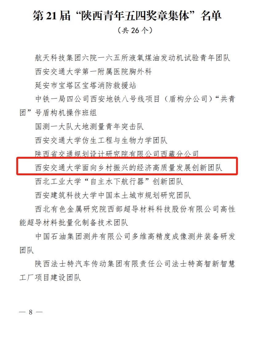 面向乡村振兴的经济高质量发展创新团队”获评“陕西青年五四奖章集体”称号。