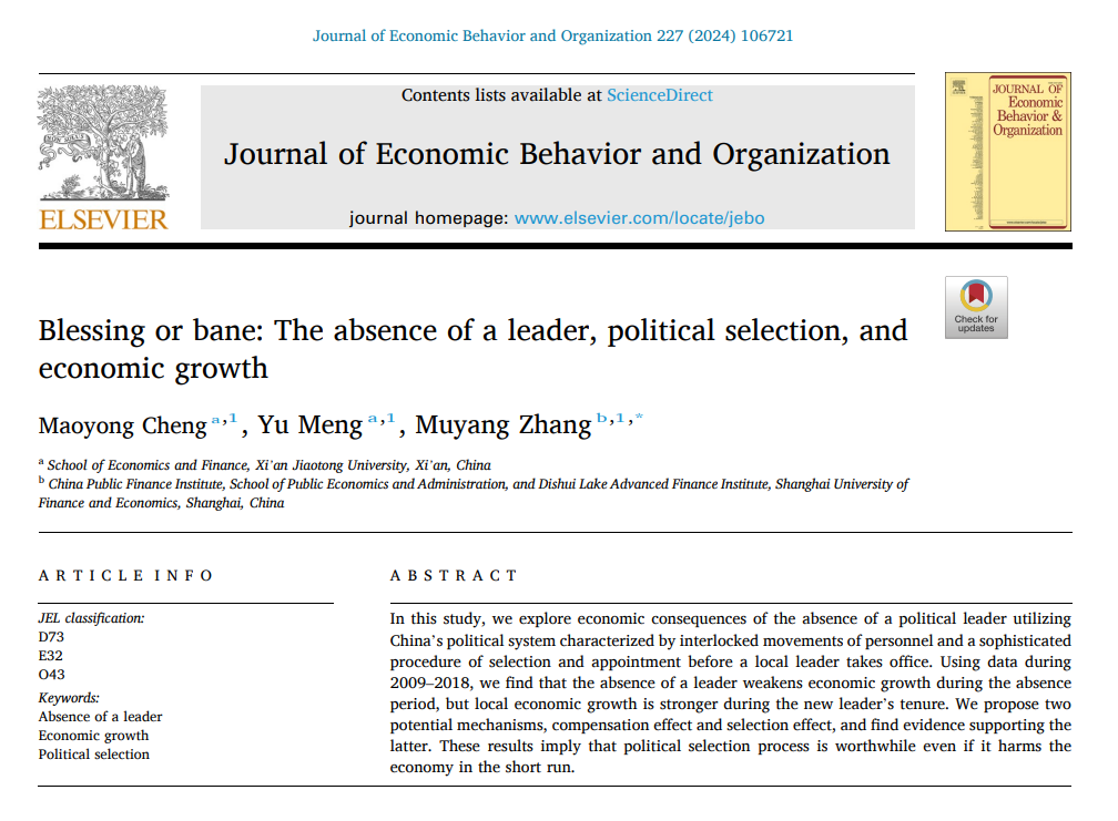 程茂勇教授、博士生孟瑜及合作者上海财经大学张牧扬教授(作者顺序按音序排列)的研究成果“Blessing or Bane: The Absence of a Leader, Political Selection, and Economic Growth”,利用中国地方政府官员任命的独特制度背景,通过手工收集2009年至2018年间中国280个城市官员的数据,系统分析了官员空缺对地方经济增长的影响。研究结果发现,官员缺位在短期内对经济增长具有显著的负面影响。然而,从长期来看,这一空缺期间所隐含的官员选拔机制却可能为地方经济注入新的活力。具体来说,缺位期间为选拔更优秀、更适合城市发展的官员提供了契机。这种选拔机制有助于实现官员与城市之间的更佳匹配,进而促进经济的长期增长。因此,在缺位后的新任官员任期内,经济增长往往呈现出强劲的反弹态势。总体来说,这一研究成果不仅揭示了官员缺位现象背后的复杂经济逻辑,更为政策制定者提供了新的思考维度。在制定官员任免、任期等制度时,应充分考虑官员空缺可能带来的双重影响。