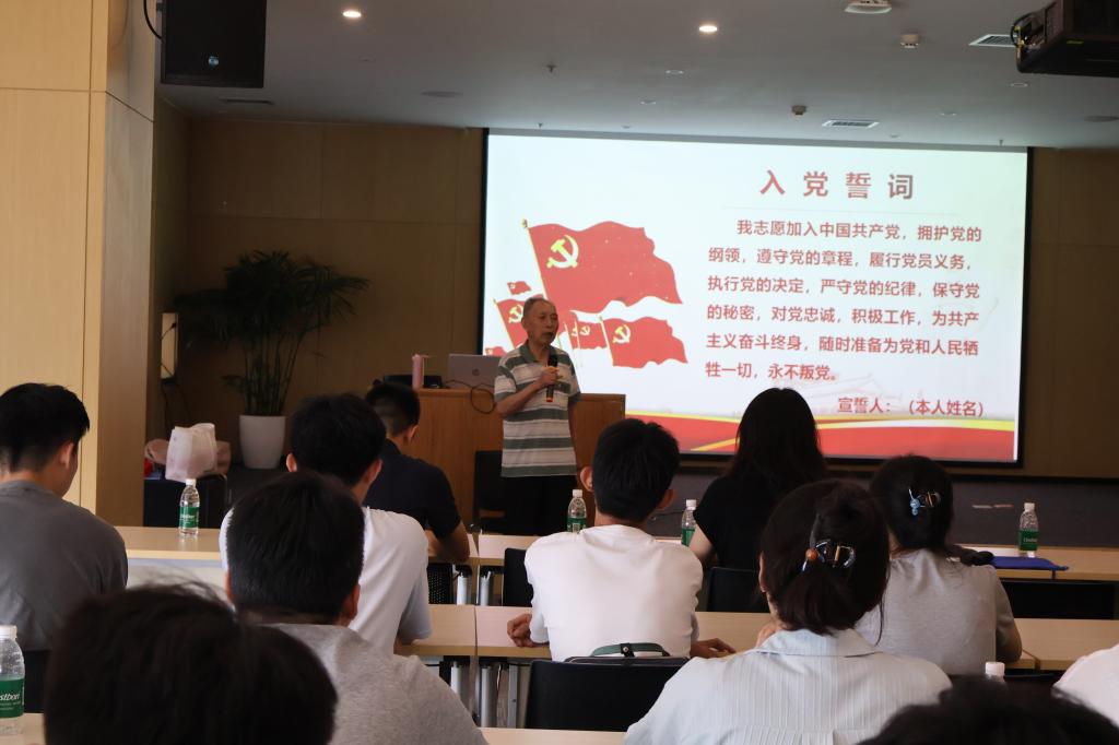 兼职辅导员、2023级博士生党支部书记石晨晖担任领誓人,带领全体新发展党员庄严宣誓,老党员们也一同重温入党誓词。面对鲜红的党旗,党员们高举右拳,誓言铿锵,表达了对党的忠诚和为共产主义事业奋斗终身的坚定决心。