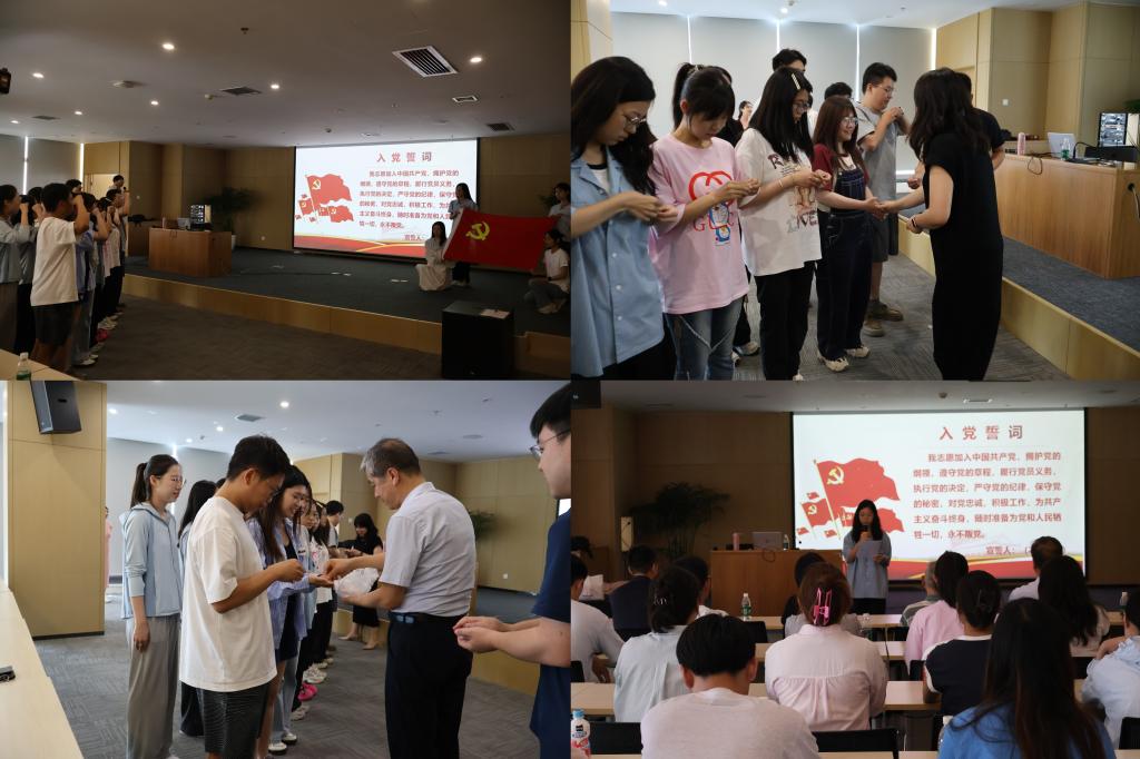 周建伦、刘小溪为新发展党员佩戴党员徽章。新党员代表程瑞祎作表态发言,她郑重承诺,自己将不忘初心、牢记使命,传承红色基因,努力做一名担当作为、拼搏奉献的共产党员。