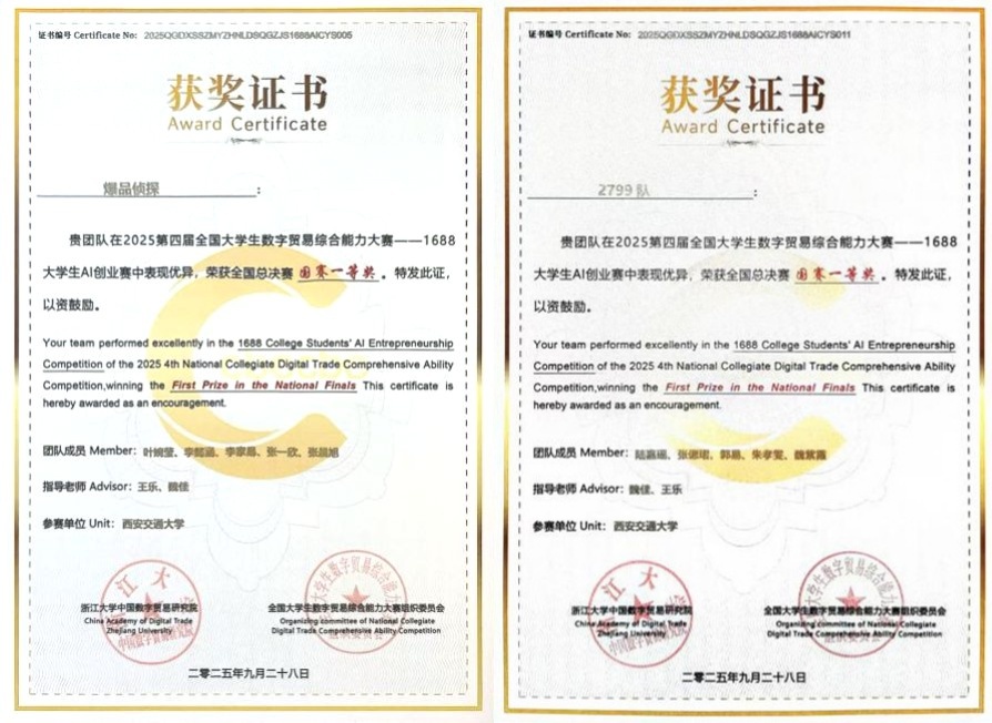 我院两支队伍在陕西省省赛中表现优异,成功入围国赛。在最终的国赛比拼中,两队凭借扎实的专业能力与出色的赛场发挥,分别摘得“1688数创铜星”和“1688数创之星”奖项,并双双斩获国赛一等奖,且各获得创业基金。两支队伍的精彩表现,充分展现了学院在数字经贸领域扎实的育人成果,以及学生的综合创新能力。