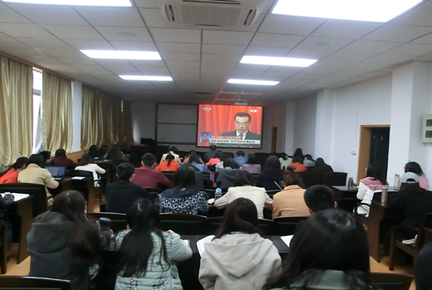 师生集中收看人大会议开幕式,聆听总理的政府工作报告,畅谈感想与体会。学院党委副书记周建伦、辅导员王平以及学生代表在财经主楼报告厅集中收看。