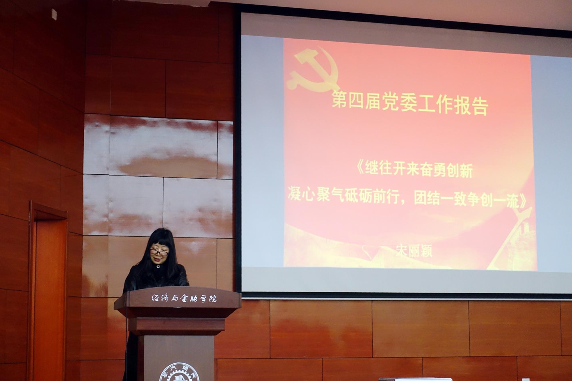 党委书记宋丽颖同志代表学院第四届党委作了题为《继往开来奋勇创新,凝心聚气砥砺前行,团结一致争创一流》的工作报告,对学院第四次党代会以来的工作进行了回顾与总结,并对学院党委下一步工作提出了目标与展望。她强调,在学校“双一流”建设和创新港内涵建设的关键时期,要充分发挥基层党委的组织力,团结全院师生,抓住机遇、求真务实、开拓创新,奋力前行,进一步深化改革,迎接新挑战,创造新贡献,为建设一流经济学院努力奋斗。
