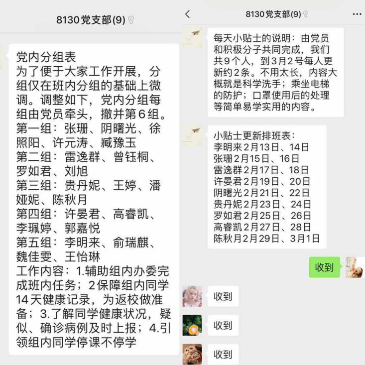 党支部成员及时汇报组内同学“健康每日报”完成情况,按时更新防疫贴士。截止目前班内同学健康状况良好,无确诊或疑似病例,贴士更新得到班级同学一致好评,为全班按时返校展开学习奠定了良好基础。