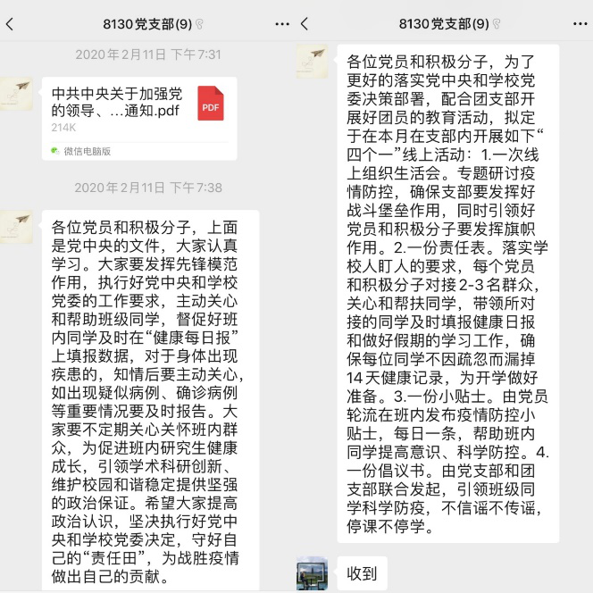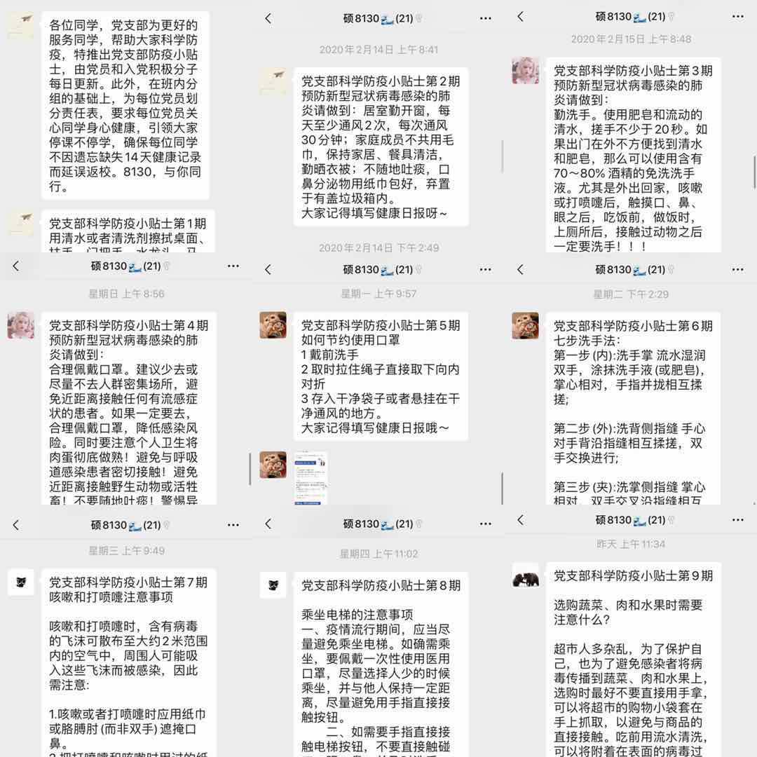 为落实中共中央关于加强党的领导、为打赢疫情防控阻击战提供坚强政治保证的通知以及学校、学院关于此次疫情防控的相关要求和措施,为保障硕8130班全体成员在此次疫情过后平安按时返校,顺利开展学习与科研工作,硕8130党支部组织开展了“青春战疫,众志成城克时坚”系列活动。