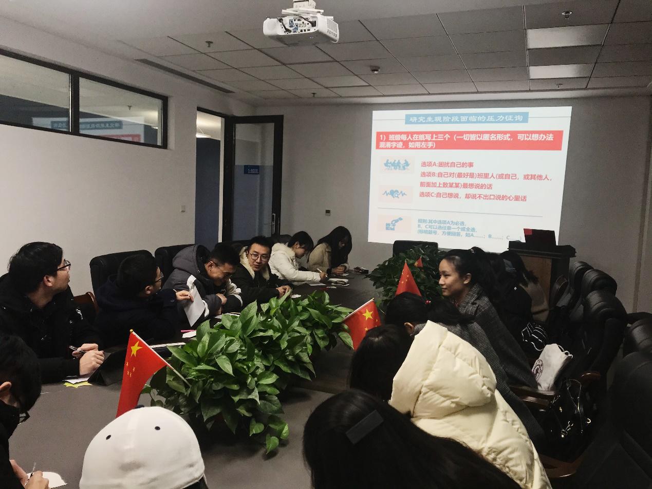 首先,郭薛南就心理健康的概念释义和标准向同学们科普了心理健康的相关知识,用通俗易懂的语言帮助同学们加深了对心理健康的了解。同学们对此表示出浓厚的兴趣,争相提出自己对心理健康知识的疑问,并根据标准评估自己目前的心理健康状态。接着,我们开展了游戏,通过写小纸条的方式让同学们记下困扰自己的事、自己对他人最想说的话以及自己说不出口的心里话,并放入纸箱,通过击鼓传花的方式让其他人念出其心声,再针对其困惑进行解答。同学在此次游戏中展现了较大的积极性,对彼此在学习、科研、生活上的难处进行了耐性的解答,互相分享了自己对“三高”专业课的学习经验、科研的心得以及减压方式。最后,每个同学在书签上写出自己对自己或他人在研究生生涯的祝福与期待。同学们从中学会表达出自己的内心感受,并在这短短三行中感受了字里行间的温情。