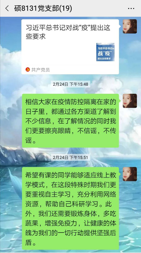 根据学校、学院团委要求,2020年2月24日下午3点,硕8131党支部在线召开了“青春战疫”线上支部大会。会议由党支部书记刘云逸和党支部组织委员、班长贾懿瑞主持,支部全体党员、预备党员及积极分子参加会议。