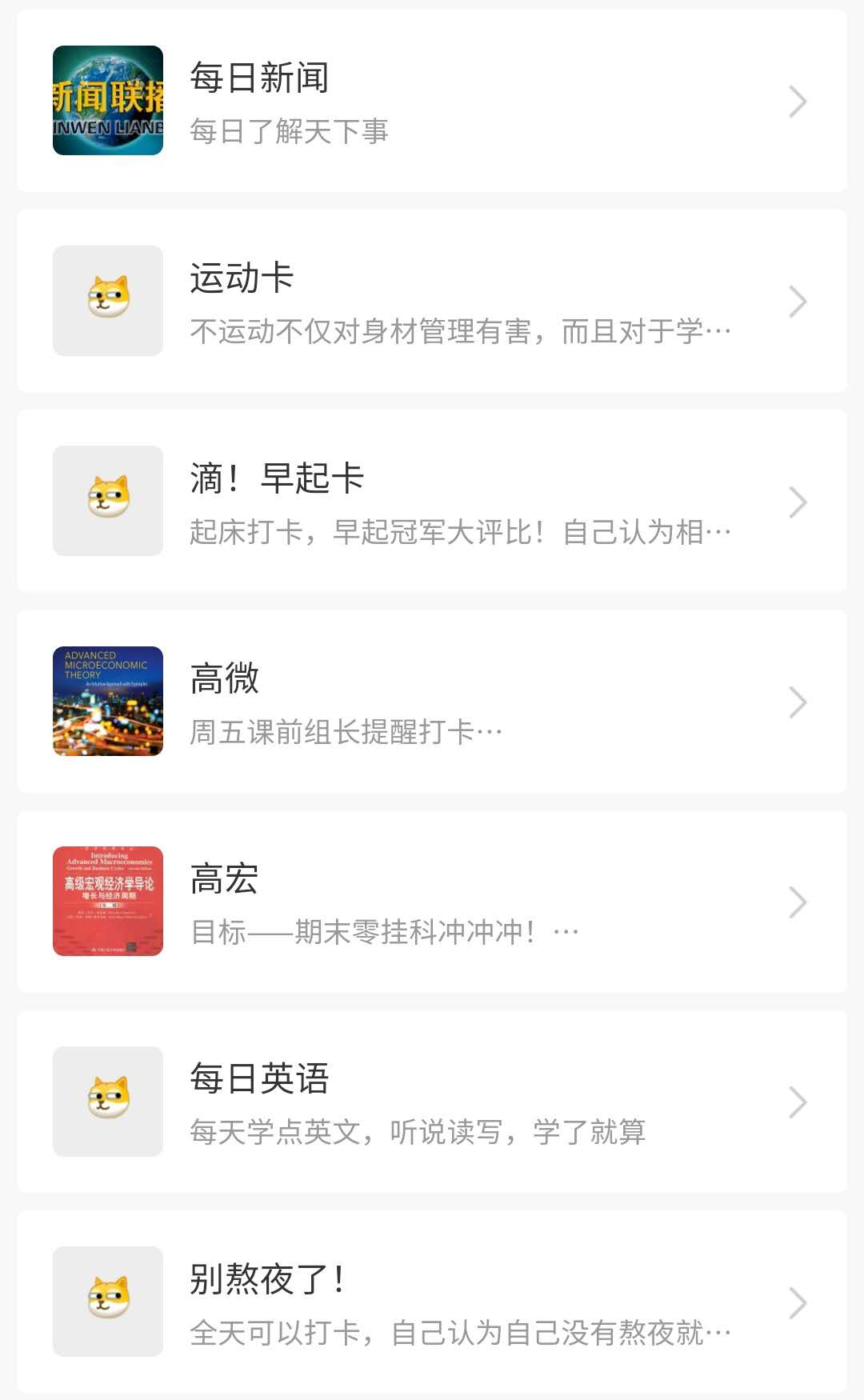 为了帮助大家在好习惯的养成方面寻找能够相互督促的伙伴,共同进步,养成良好的学习和生活习惯,从而增进身心健康,快乐学习,同时培养良好的同学情谊。S0158团支部组织大家根据自身实际情况分成习惯小组,进行每日线上打卡,线下相互监督,并以每周总结体会和改进方向的形式,使大家相互鼓励,共同在养成好习惯的道路上前进。