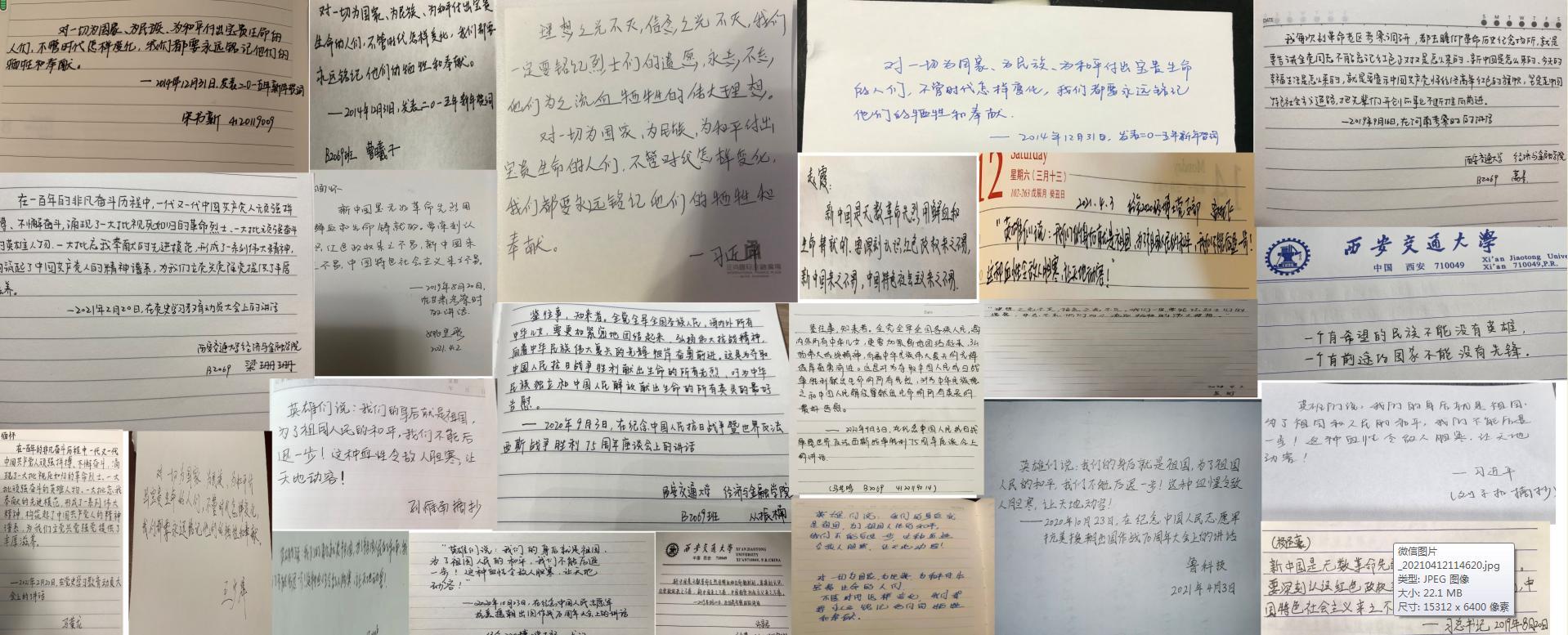 回望百年奋斗,同学们深切感触到今天的幸福生活,是革命先烈们用生命和热血换来的,作为新时代新青年,要心存敬仰与感激,铭记英烈,牢记他们的事迹,传扬英雄精神。作为共产党员,更要坚定理想信念,强化责任意识,始终保持艰苦奋斗、求真务实的学习工作作风,为交大双一流建设,为国家发展贡献力量。