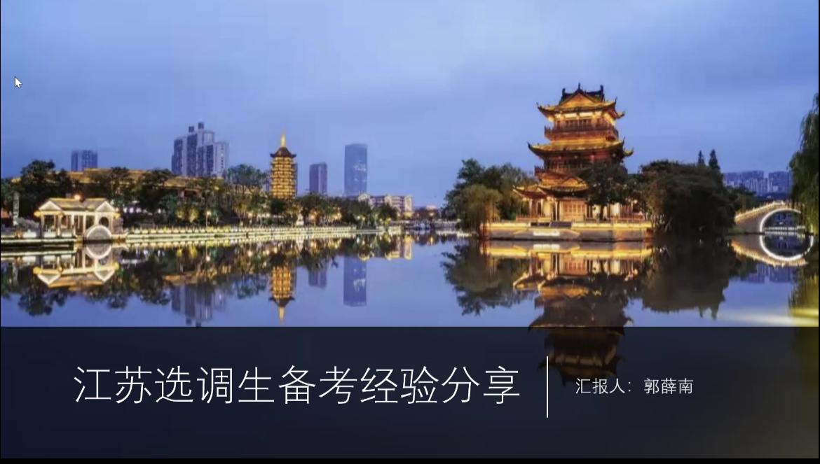 会议伊始,为更好帮助支部成员进行职路探索,支部邀请院2019级硕士生学姐郭薛南为大家进行了江苏名校优选选调生备考经验分享。郭薛南学姐从个人情况、江苏名校优选条件、选调程序、报考情况、笔试题型、备考建议六个方面为支部成员进行了详细的介绍与个人经验分享,郭薛南学姐强调,江苏名校优选计划对考生个人条件要求较高,不同职位、地区的报录比不尽相同,采取笔试与考察结合的考试形式,考生应根据报考地要求做好任职、荣誉积累,根据自身情况合理选择属地、职位、课程,合理分配考试时间。