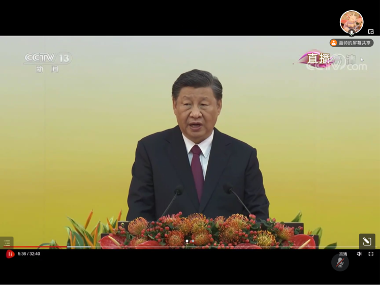 会议由聂帅同志主持,第一部分为学习重温习近平总书记在庆祝香港回归祖国25周年大会暨香港特别行政区第六届政府就职典礼上的重要讲话精神。习近平总书记指出,回归祖国后,香港发挥连接祖国内地同世界各地的重要桥梁和窗口作用,为祖国创造经济长期平稳快速发展的奇迹做出了不可替代的贡献,战胜各种风雨挑战,稳步前行,香港同胞实现当家作主,实行“港人治港”、高度自治,香港真正地民主由此开启。未来,必须全面贯彻“一国两制”方针,坚持中央全面管治权和保障特别行政区高度自治权相统一,落实“爱国者治港”,保持香港的独特地位和优势。习近平总书记的讲话使大家深刻地感受到,香港的前途与祖国的前途紧密联系在一起,香港会从国家的快速发展中获得莫大利益。牢记历史,以史为鉴,我们要努力使我们的祖国更加繁荣富强。