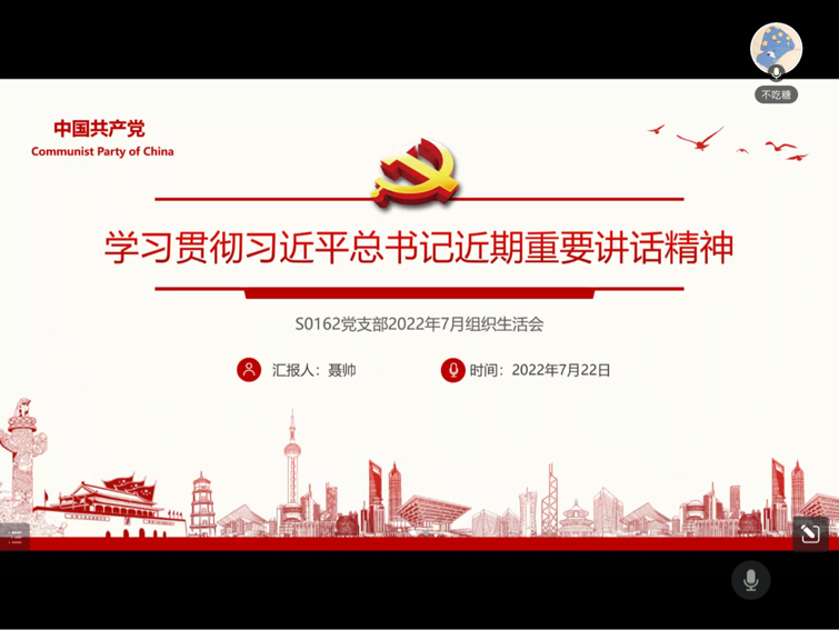 2022年7月以来,习近平总书记赴香港参加庆祝香港回归祖国25周年大会暨香港特别行政区第六届政府就职典礼,给中国博物馆老专家与参加海峡青年论坛的台湾青年回信,近期又赴新疆考察,在繁忙的行程中发表了系列重要讲话。为学习重要讲话精神,硕0162党支部于7月22日开展了“学讲话精神,永远跟党走”为主题的组织生活会,全体成员参加。